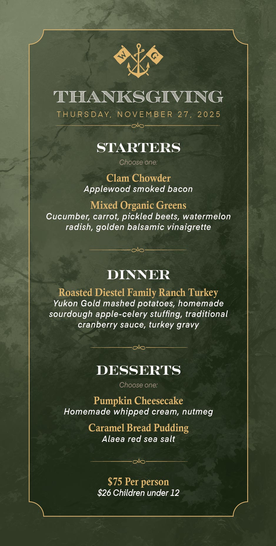 We’re hosting Thanksgiving this year! Gather with us on Thursday, November 27. Our special three-course Thanksgiving menu will be available all day, in addition to our full menu.