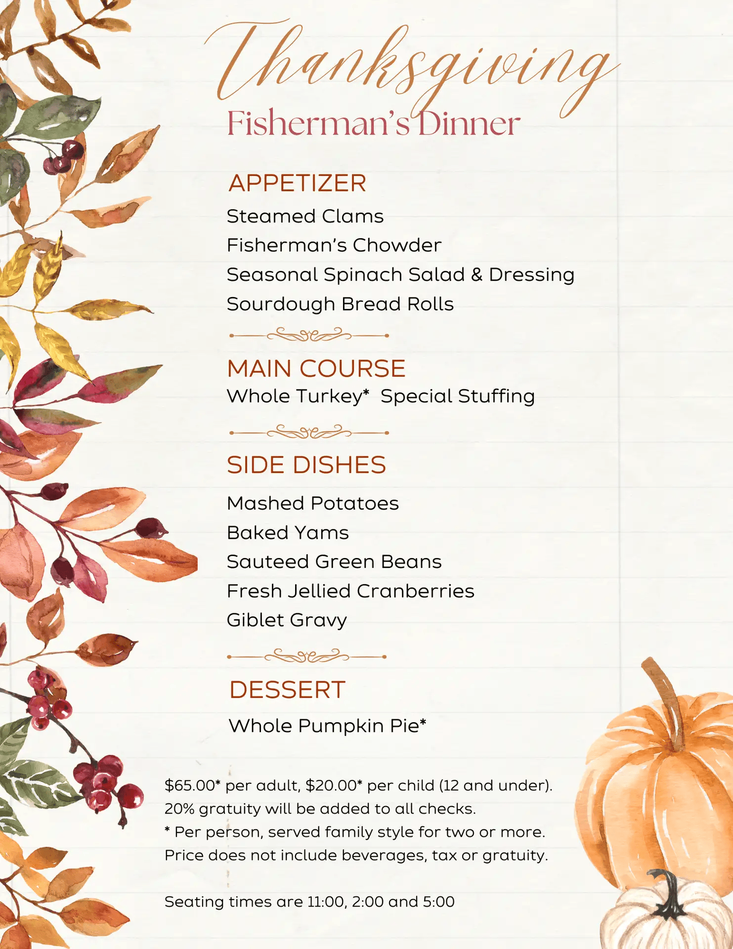 Three-Course Thanksgiving Menu: $75; $26 children 12 and under (excluding tax and gratuity)